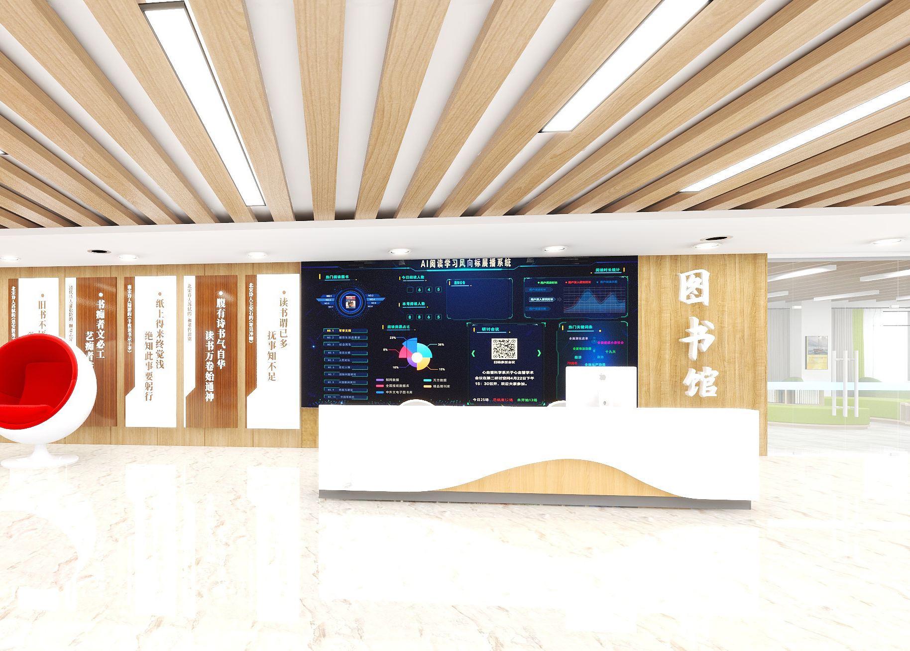 AI閱讀學(xué)習(xí)風(fēng)向標(biāo)展播系統(tǒng)一般用于放置在圖書館大廳,或者AI閱覽室大廳,用于實(shí)時(shí)統(tǒng)計(jì)、分析、整理當(dāng)前所有讀者在AI閱覽桌上的學(xué)習(xí)情況,看了哪些內(nèi)容、閱讀時(shí)長(zhǎng)、深入研究時(shí)長(zhǎng)、查找內(nèi)容等實(shí)時(shí)閱讀情況,同時(shí)將所有內(nèi)容實(shí)時(shí)統(tǒng)計(jì)、分析、歸類整理,形成實(shí)時(shí)的閱讀學(xué)習(xí)風(fēng)向標(biāo)報(bào)告在大屏上進(jìn)行展播,讓讀者和管理員及時(shí)掌握?qǐng)D書館的閱讀情況和學(xué)習(xí)風(fēng)向標(biāo)。 同時(shí)集成100種報(bào)紙、200種期刊、2000本圖書、碎片化紙質(zhì)圖書數(shù)據(jù)庫(kù)和藝術(shù)圖片庫(kù)。