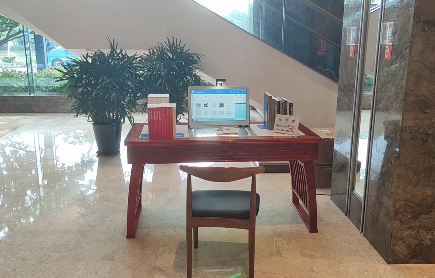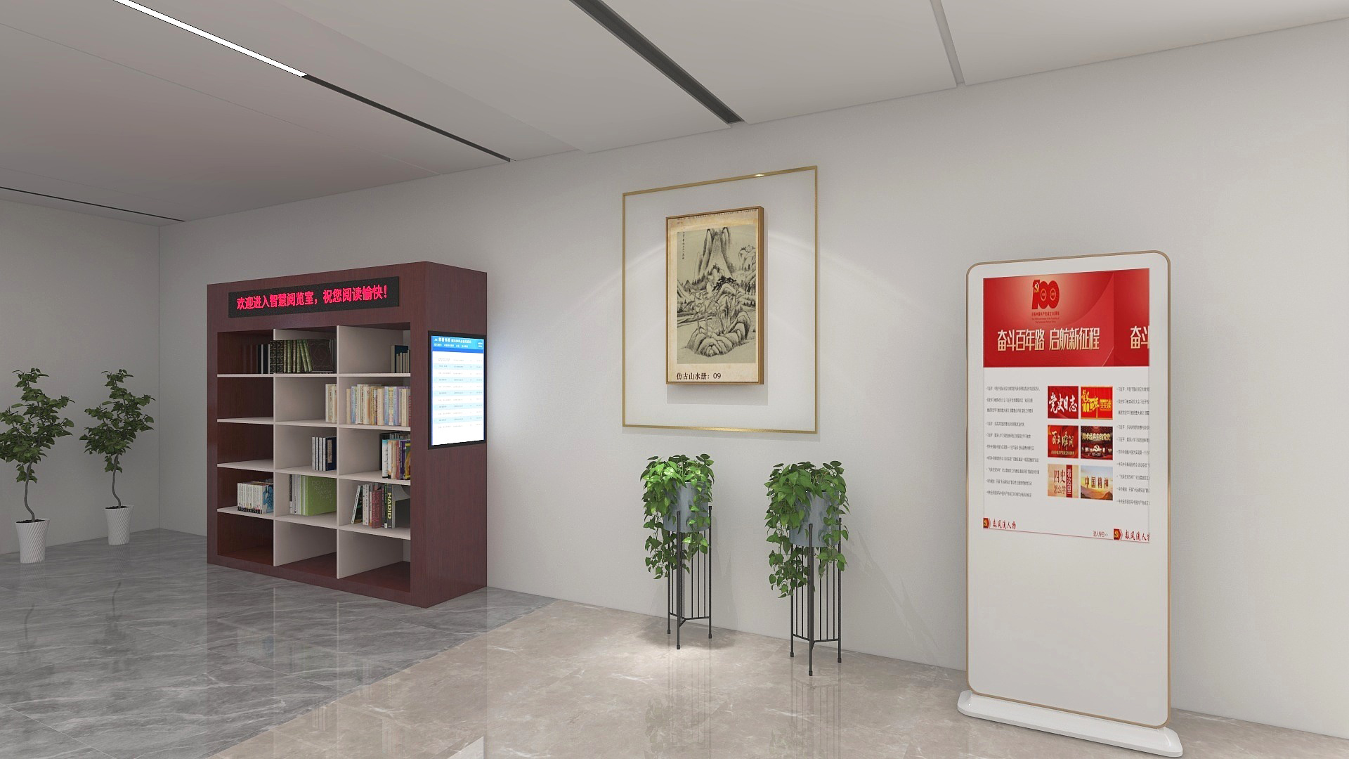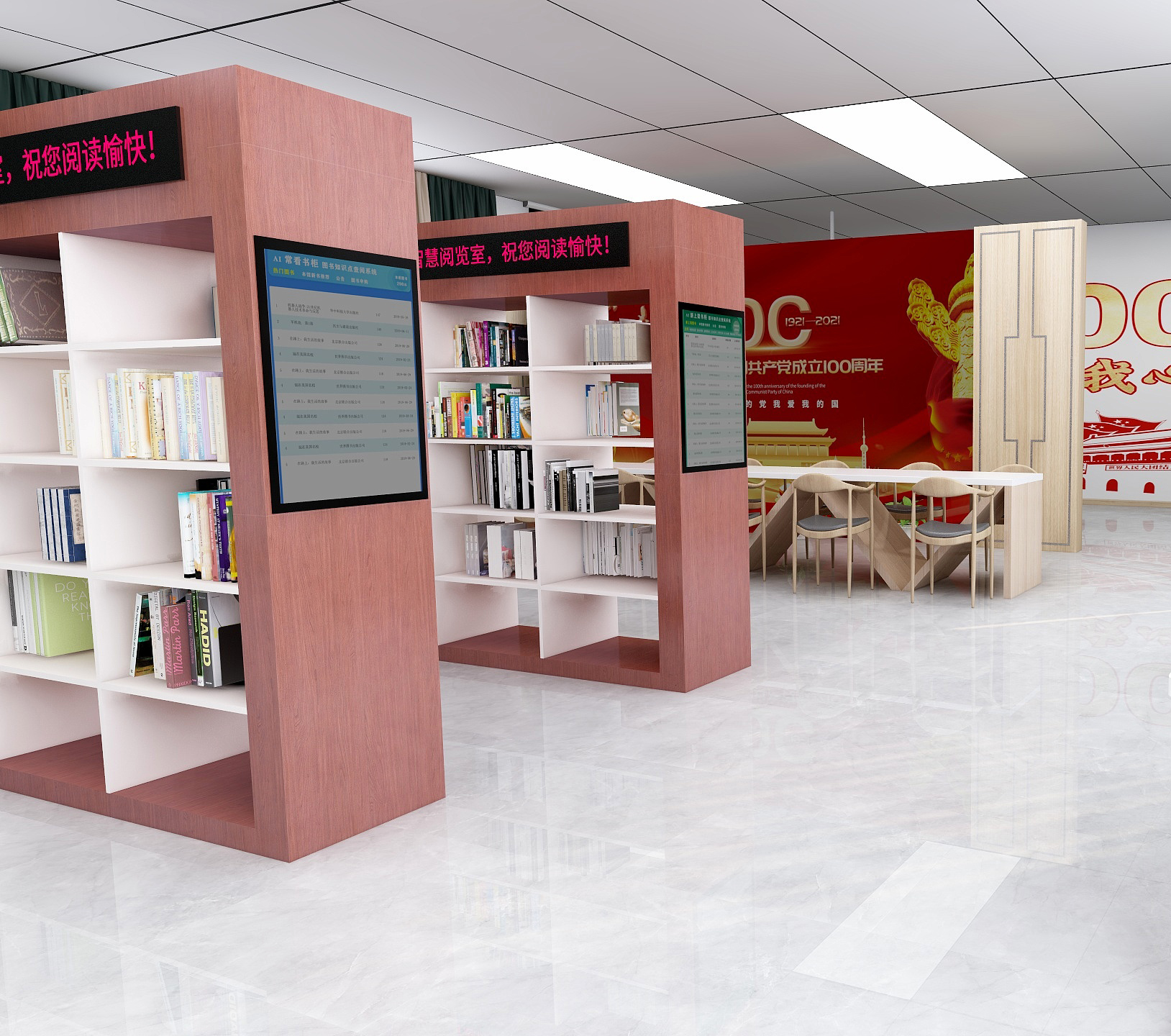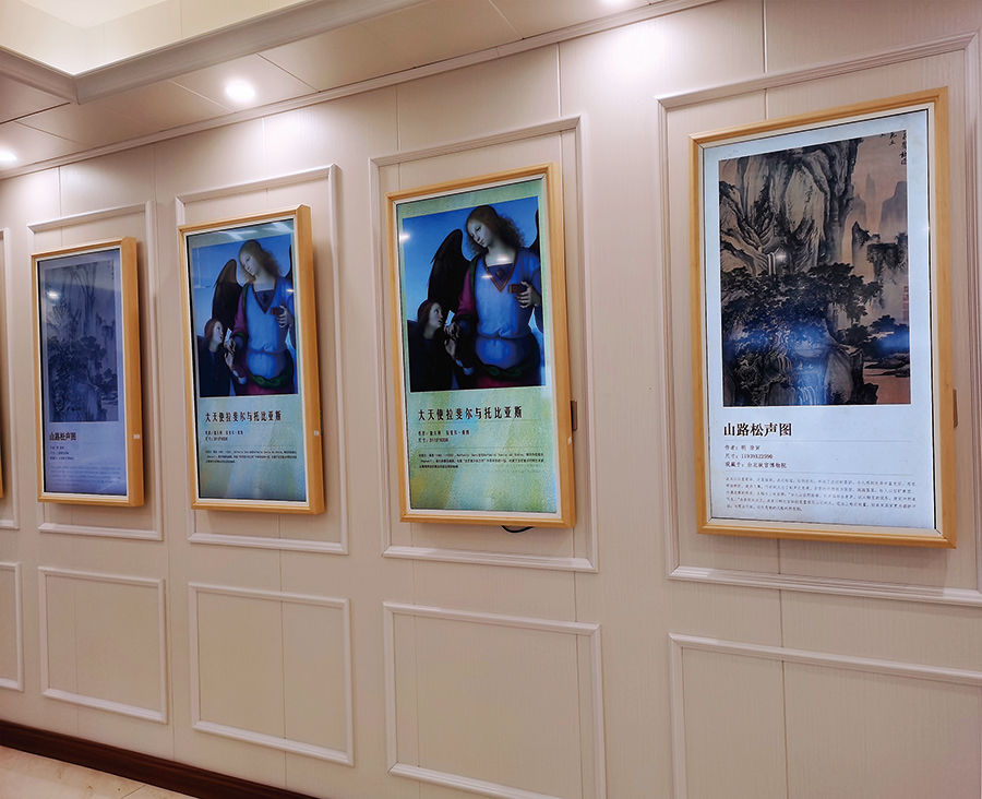 在圖書館內(nèi)的墻面上掛上AI交互智慧屏,通過(guò)跳馬燈的形式展示相關(guān)的油畫、校史資料、活動(dòng)展播或人物資料,給參觀者一種視覺上的沖擊,使人更容易進(jìn)入一種沉浸式欣賞場(chǎng)景。當(dāng)讀者站在AI交互智慧屏前時(shí),會(huì)有攝像頭對(duì)其進(jìn)行人臉識(shí)別,AI交互智慧屏上將會(huì)呈現(xiàn)眼前讀者在圖書館內(nèi)的閱讀軌跡以及為讀者推薦相關(guān)圖書、報(bào)紙、期刊、數(shù)據(jù)庫(kù)條目,讓讀者獲取到更多的知識(shí)服務(wù)。AI交互閱讀智慧屏可以放置于學(xué)生宿舍、食堂或教室走廊等人流處,隨走隨薦隨學(xué)、校史展播、活動(dòng)展播、藝術(shù)作品展播、營(yíng)造沉浸式閱讀場(chǎng)景,讓學(xué)員隨時(shí)隨地感受智慧圖書館文化場(chǎng)景,走出圖書館服務(wù)于全校師生。